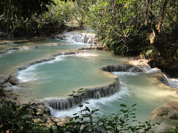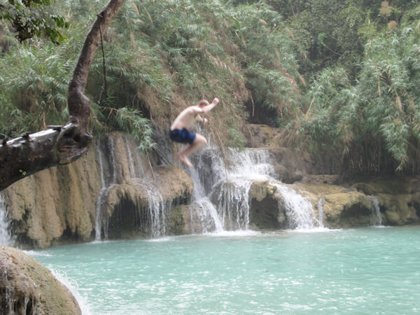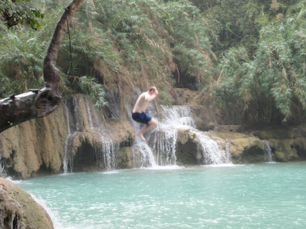 Luang Prabang was a welcome sight after having being on a boat and remote village overnight. Western food was available everywhere as was good quality, cheap accomodation. We enjoyed our time here strolling through the enormous night market and river front. We also headed out to the waterfall where we met some Irish people in the Tuk Tuk. On the way there the weather made a turn for the worse and there was a sudden heavy downpour, we had read the weather in advance and hadn't expected rain until the evening, but thankfully it passed quickly and we went on to enjoy our day here. We started off by jumping into the bottom pool at the falls before making our way up to see each of the higher tiered pools before eventually climbing up to the very top of the falls. This involved a very step ascent and descent and provided only a mediocre view of the falls and surrounding forest while having only questionable safety.