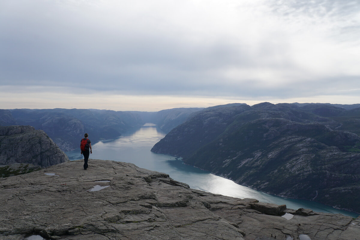 you snake around a cliff face to reach the flat top tower of Pulpit rock with provides an over-arching viewing platform above the Lysefjord. The platform sits at 604 metres.